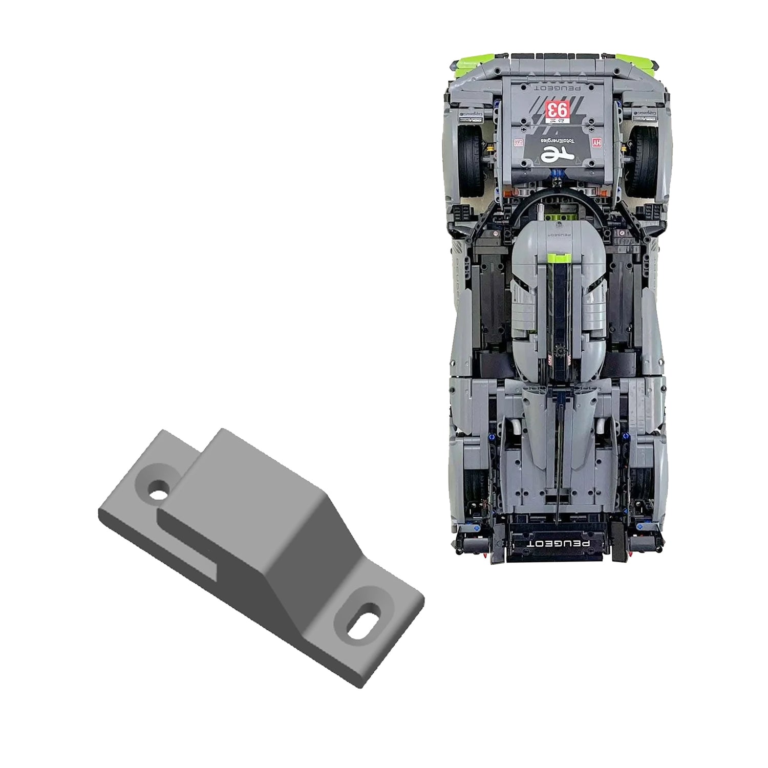 3D-printet veggfeste for (42156) PEUGEOT 9X8 24H Le Mans Hybrid Hypercar for å veggfeste Lego-bilen med fronten pekende opp.